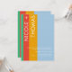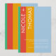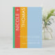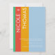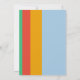 Este convite de casamento moderno e minimalista apresenta faixas verticais ousadas em verde, vermelho e amarelo, contra um fundo azul claro e caloroso. O design combina tipografia limpa com um toque pessoal, mostrando os nomes dos casais em uma fonte manuscrita. Os detalhes restantes estão em um estilo sans-serif elegante. O layout é simples, alinhado à direita e fácil de ler, permitindo que a personalização se ajuste aos detalhes exclusivos do seu casamento. Perfeito para casais que amam cores vibrantes e uma estética moderna, este convite pode ser adaptado para refletir o seu dia especial.