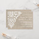 Este convite de casamento rústico mostra uma pincelada de fundo com uma design de damasco branco desbotado. A mistura perfeita de materiais rústicos com a elegância de damask detalhando. Perfeito para o casamento do celeiro, casamento ao ar livre, casamento no campo, casamento rústico, casamento vintage ou casamento elegante.