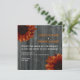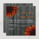 Um convite para o casamento de outono com uma foto de fundo de madeira de celeiro. As fotos antigas inspiraram os giros nos cantos superior esquerdo e inferior direito. Personalize o texto correspondente com detalhes do evento. Flor de solteiro no centro, sobre fundo de madeira.