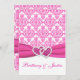 Este bonito convite para casamentos tema damasco cor-de-rosa e branco tem uma fita impressa rosa-quente e um par de joias de diamante brilhante coladas IMPRESSAS corações. Seria perfeito para um romântico casamento temático rosa e branco. O texto e o papel são todos personalizáveis. Se você precisar de outros itens correspondentes, envie um e-mail para niteowlstudio@gmail.com.