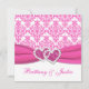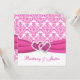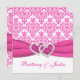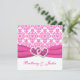 Este bonito convite para casamentos tema damasco cor-de-rosa e branco tem uma fita IMPRESSA rosa-quente e um par de corações com joias de diamante brilhante coladas IMPRESSAS. Seria perfeito para um romântico casamento temático rosa e branco. O texto e o papel são todos personalizáveis. Se você precisar de outros itens correspondentes, envie um e-mail para niteowlstudio@gmail.com.