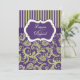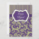 Este convite de casamento roxo, branco e verde moderno com listras e cores damasco florais seria perfeito para um tema de casamento roxo e verde. O texto e o papel são personalizáveis. Se você precisar de outros itens correspondentes, envie seu pedido por e-mail para niteowlstudio@gmail.com. Os itens correspondentes existentes são mostrados abaixo.