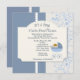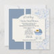 Um convite na moda azul e branco com bolinhas minúsculas, escamas, videiras delicadas, cobertas por um painel decorativo com as palavras "É um garoto!" e embelezado com um bebê espreitando de sua carruagem.