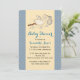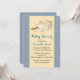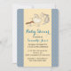 O convite para chá do bebê na moda feito em um amarelo-ouro pálido, com um ouro amarelo no padrão azul-turquesa, escorrendo pelos dois lados. Lindos gráficos de uma cegonha voando com um feixe de bebês, decoram o topo do convite. Personalize o texto azul-turquesa e cinza escura para o evento do seu chá de fraldas. Adorável convite para a futura mãe.