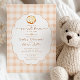 Celebre o seu pequeno com este encantador convite de chá de bebê “Há um Doce no Forno”. Com um delicado rolo de canela em aquarela, fundo xadrez pêssego suave e uma moldura rendilhada elegante, este design combina a doçura inspirada em padarias com charme atemporal de fazenda.