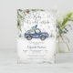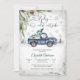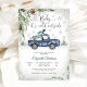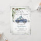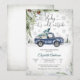 Celebre com um estilo aconchegante com este encantador convite de chá de bebê de inverno, apresentando um caminhão vintage azul em aquarela carregando uma árvore de Natal e presentes. Flocos de neve, galhos de pinheiro e árvores sempre verdes criam um pano de fundo festivo da estação, enquanto a elegante caligrafia "Bebê, está frio lá fora" adiciona um toque caprichoso. Perfeito para celebrações de inverno, este design personalizável combina charme rústico com alegria natalina, tornando-o ideal para homenagear os futuros pais durante os meses mais frios.