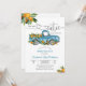 Celebre a chegada do seu pequeno querido com este encantador convite de chá de bebê, apresentando uma antiga camionete azul vintage transbordando de laranjas e folhagens. O design divertido "Oh Boy! A Little Cutie Has Arrived" (Ah, um menino! Chegou um pequeno querido) estabelece um tom alegre para a sua celebração. Perfeito para festas com temas rústicos, cítricos ou de fazenda, este convite combina estilo caprichoso com elegância moderna. Personalize com os detalhes do seu evento para criar um souvenir memorável para familiares e amigos.