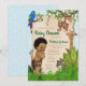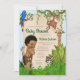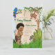 Convites de chá de bebê de safári menino com adorável menino americano-africano com cabelo afro e animais de safári em um fundo azul damasco da selva. Este convite de chá de bebê de safári menino é facilmente personalizado para o seu evento, basta adicionar o seu texto.