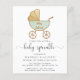 Este convite para chá de bebê econômico e neutro em termos de gênero apresenta uma aquarela em verde menta pastel e dourado de uma carruagem de bebê retrô. Você pode personalizar o texto na carruagem (por exemplo, "É uma menina!) ou deixá-lo em branco. "Chá de bebê" é escrito em um script elegante com floreios.