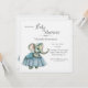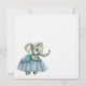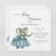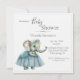 Adorável elefante bebê desenhado à mão com aquarela em um convite de chá de fraldas azul. As cores suaves simples definem o tom de um doce chá de fraldas temático. Um convite tão doce e simples para esse evento especial.