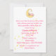 O convite para o bebê é feito em branco, com gráficos de uma menina dormindo, na lua, com estrelas amarelas correndo pelo convite. O texto a rosa está pronto para personalizar o evento de chá de fraldas. É um convite bonito para a mãe ser querida.