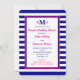 Este convite para chá de casamento de código de casal náutico é apresentado em azul marinho, branco e rosa quente. O monograma da noiva e do noivo é o ponto focal, em azul-marinho e rosa, com os detalhes do chá do casal, em branco, que está borrado em azul-marinho e rosa-quente em um fundo de risca branca e marinho. Este é um convite de excelente para um chá com tema náutico casal. Direitos autorais
