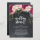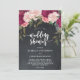 Um belo convite para chás de casamento florais cor-de-rosa e arroxeado, com fundo de efeito de quadro-negro, com acentos verdes e um lado inverso de giz coordenado. Fácil de editar ou excluir os campos de texto disponíveis para personalizar as informações com seus próprios detalhes para um convite personalizado e profissional. Muitos itens correspondentes nesta coleção de boho. Por favor, visite meu compro para ver a faixa de cheios e criar um conjunto de itens usando este adorável design.