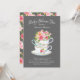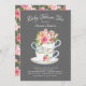 Xícaras de chá de porcelana, com bonito cor-de-rosa, em fundo de película de cinza para uma festa de chá de chá de fraldas.
