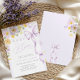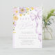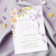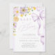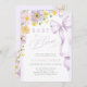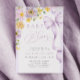Celebre a temporada dos novos começos com este doce bebê no convite para o chá de fraldas Bloom, com florais suaves, lilases e amarelos, um delicado arco lilás e um charmoso design de inspiração coqueta.