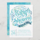Este simples e elegante convite para chás de fraldas apresenta uma aqua doce e tons azuis/verdes, saltados com a tipografia moderna.