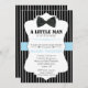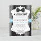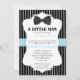 Este convite para o chá de fraldas de preciosos é uma maneira maravilhosa de convidar seus convidados a se juntar a vocês para comemorar sua nova chegada. Este design tem um fundo preto e branco com uma banda branca e azul no centro. No topo há um gráfico preto de uma gravata de arco. Os detalhes de sua festa ficam abaixo do centro e são completamente personalizáveis. Basta adicionar os detalhes do seu Chá e você está pronto para ir!