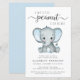 Um belo convite de chá para bebês, amigável em orçamento, com "A Sweet Little Peanut Is On Your Way" escrito em tipografia moderna de cinza mole e roteiro de na moda, e uma coloração de água azul pastel de um elefante para bebês. Personalize o nome da mãe e os detalhes do chá em uma simples tipografia de cinza.