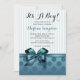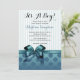Este clássico, elegante convite para chá de fraldas de menina azul apresenta um grande arco de cetim azul com listras e bolinhas azuis que diz "É um menino!". Um convite para chá para aquela mamãe muito especial.