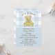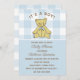Este convite de chá de fraldas azul mostra um doce urso vestindo um arco azul com um padrão de verificação de búfalos azul e branco atrás. O texto acima diz "É um menino!" A seção inferior do cartão é azul com detalhes de amostra para personalizar. A parte de trás do convite é decorada com verificação de búfalos azuis e brancos.