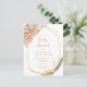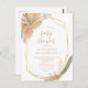 O presente convite de chá de fraldas de vassoura apresenta uma estrutura geométrica dourada decorada com folhas de palma tropicais secas a cores aquáticas e erva-pampas em tons de bege, pêssego e verde-úmido. Personalize o texto bege com os detalhes do seu chá de fraldas.