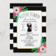 Um convite de chá de fraldas com ilustração de um gambá bebê vestindo uma coroa de flores rosa. Personalize o texto. O fundo é um padrão listrado preto e branco.