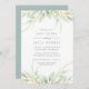 O convite de chá de fraldas botânico Elegante para aquarelas enquadra seus detalhes de chá de panela com uma borda de folhagem pastel em verde-claro e legal.
