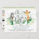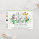Chá de fraldas Safari com animais da selva, elefante, girafa e zebra. A parte de trás do convite tem um padrão listrado colorido.
