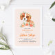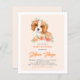Convide convidados para o seu evento com este convite de chá de fraldas personalizável. Apresenta ilustrações de aquarela de um bonito rei cavaleiro Charles Spaniel e flores de pêssego. Personalize adicionando seus detalhes. Este belo convite à colina de fronteira é perfeito para aniversários, chás de fraldas e outros eventos.