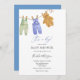 Convite ao chá de fraldas com uma ilustração adorável de roupas de bebê clássicas de vintage, penduradas numa linha de roupas. Personalize com suas informações ou clique em "Clique para personalizar mais" para editar estilos de fonte, tamanho e cores.