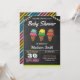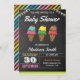Encontrem seus convidados com este chá de fraldas colorido, convidando com cones bonitos de sorvete com tipografia moderna em um fundo de quadro. Basta adicionar os detalhes do seu evento neste modelo fácil de usar para torná-lo um convite de tipo único. Sacudir a placa para revelar um padrão colorido de listras na parte traseira da placa.