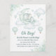 Celebre a chegada de um bebê com este anúncio charmoso de chá de fraldas com um elefante bebê dormindo em uma lua crescente cercado por balões de ar quente verde-claro e verde-claro e estrelas douradas. O design, com seu esquema de cor suave e folhas e galhos delicados, cria uma estética pacífica e caprichosa. A mensagem 'Oh Boy! Um pequeno amendoim está no caminho!' em uma letra ousada e estilizada adiciona um toque de entusiasmo a esse adorável cartão de saudação. Perfeito por receber o mais novo membro da família!