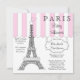 Design listrado estilo boutique, branco e cinza-rosa, com estilo quadrado e cor-de-rosa, apresentando a Torre Eiffel Parisiense no lado esquerdo, um letreiro pendurado à direita com seu nome e sala para os detalhes do seu chá abaixo. Acessórios de coordenação disponíveis. Criado por Designs Holiday Hearts para HHBabyShop.