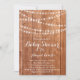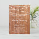 Escrita de fita rico e luzes cintilantes de cordas decoram este convite de chá de fraldas sobre um fundo de madeira leve, fazer perfeito para o chá de fraldas rústico, rural, ocidental ou tradicional que é acentuado com luzes de cordas.