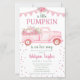 Este adorável convite de chá de fraldas de orçamento de 5,5" x 8,5" com um caminhão cor-de-água rosa carregado com abóboras brancas e cor-de-rosa com detalhes de brilho dourado e pulverizações de eucalipto e flores cor-de-rosa multiabaçar com folhas douradas, seria perfeito para o seu chá! É fabuloso para um chá de fraldas de outono ou colheita. Ele tem um dorso cor-de-rosa macio coordenado com pequenas bolinhas brancas. Tão fofo por receber um doce bebê novo!