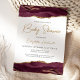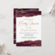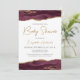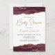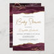 Este convite de chá de fraldas de tendência apresenta uma borda superior e inferior do geode de agate de aquarela em tons de burgundy com realces falsos de brilho dourado. As palavras "Chá de fraldas" e o nome da futura mãe aparecem no guião dourado. Adicione os detalhes da parte em cinzas de carvão em um fundo branco. Uma imagem de burgundy e dourada correspondente aparece no lado oposto.