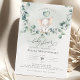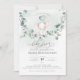 Um pequeno elefante giro numa oscilação de eucalipto. Este convite para chás de fraldas apresenta aquarelas desenhadas à mão e fontes modernas.