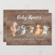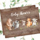 Adorável convite de chá de fraldas de floresta com os animais de floresta mais bonitos...Urso, guaxinim, rato, raposa e coelhinho em um fundo de madeira rústica.