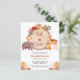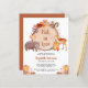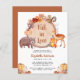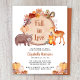 Convite para chás de fraldas, de tipo rústico, com matrizes de outono, com uma coroa constituída por aquarelas bonitinhas de animais da floresta (veados, esquilos, ursos e raposas), flores de terracota e abóboras de folhagem e laranja e creme. "Fall in Love" e o nome da futura mãe são escritos em um roteiro laranja queimado.
