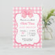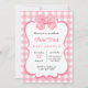 Este convite para chás de fraldas apresenta um fundo de gingham rosa e branco com um arco de aquarela rosa grande no topo. A área central é moldada com uma borda rosa escalpada, perfeita para adicionar texto personalizado. O design é charmoso e elegante, ideal para celebrar uma menina.