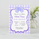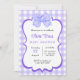 Este convite para chás de fraldas apresenta um fundo de gingham roxo e branco com um arco de aquarela roxo grande no topo. A área central é estruturada com uma borda roxa escalpada, perfeita para adicionar texto personalizado. O design é charmoso e elegante, ideal para celebrar uma menina.