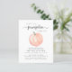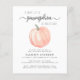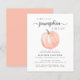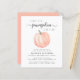 Um convite para chá de fraldas de outono, amigo do orçamento e neutro, com "A Sweet Little Pumpkin Is On Your Way" escrito em tipografia de cinzas e um roteiro de na moda e uma linda aquarela de abóbora laranja. Personalize o nome da mãe e os detalhes do chá em uma simples tipografia de cinza. Especificar o sexo do bebê, se desejado (por exemplo, "está a caminho").