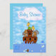 Convite para Chá de fraldas de Arca de Noah com o barco e animais de Noah que incluem duas girafas, duas zebras, dois leões, dois elefantes, uma tartaruga e um peixe.