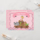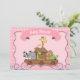Convite para Chás de fraldas de Arca de Noah Rosa para Meninas. Design tem um fundo de xadrez, um cheio de arca de animais e um banner com as palavras chá de fraldas.