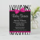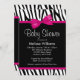 Um padrão de zebra preto e branco moderno com um gráfico de arco rosa-quente é apresentado neste convite para chás de fraldas divertidos. Perfeito para um chá de fraldas de menina!Os Designs são ilustrações/gráficos impressos - NÃO É REAL.