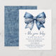 Apresentando um adorável convite para um chá de fraldas encantador que incorpora a essência do charme do país! Essa design encantadora apresenta um arco impressão jean azul, branco, adormecido com pérolas refinadas e detalhes de rendas que acrescentam um toque de elegância. O belo contraste contra o fundo branco suave cria um apelo visual impressionante. Ao virar o verso desvenda-se um impressão azul-rústico, que aumenta o alento rural do convite. Torne esta peça extraordinária verdadeiramente sua personalizando-a com seus detalhes exclusivos.