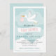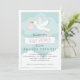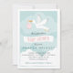 Um convite de chá de fraldas encantador para uma menina, com um lindo esquema de cor rosa, azul-lacrimogêneo e branco. Uma tempestade feliz coze com carregando um novo pacote de alegria enquanto ele voa contra um céu azul aqua macio que é pontilhado com nuvens fofinhas. Um símbolo tradicional recebe um olhar atualizado nessa visão completamente moderna do tema com ilustração original e trendy, tipografia caprichosa.