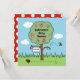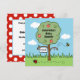 Um doce convite para celebrar um chá de fraldas. A carta apresenta uma cena colorida de jardim com uma macieira, um mamangabo zunhando e uma joia de pássaros esfregando no chão.