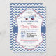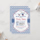 Este convite de chá de fraldas de avião para brinquedos antigos vem com um avião de brinquedo antigo em vermelho, azul e branco. O rótulo tem espirros em torno da redação com bolinhas na borda, em azul. O fundo é impressão de chevron em azul e branco.
