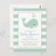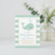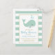 Este doce cartão postal de convite para chás de fraldas, neutro em termos de gênero, apresenta uma bela baleia verde-menta, saltando gotas de água azul. As palavras "Chá de fraldas" e o nome personalizável da futura mãe aparecem na letra azul de escrita manual correspondente. Além da falso estrutura retangular em ouro, há um fundo de listras verdes e brancas da casa da moeda. Ideal para um chá de fraldas náutico, baleia ou submarino.